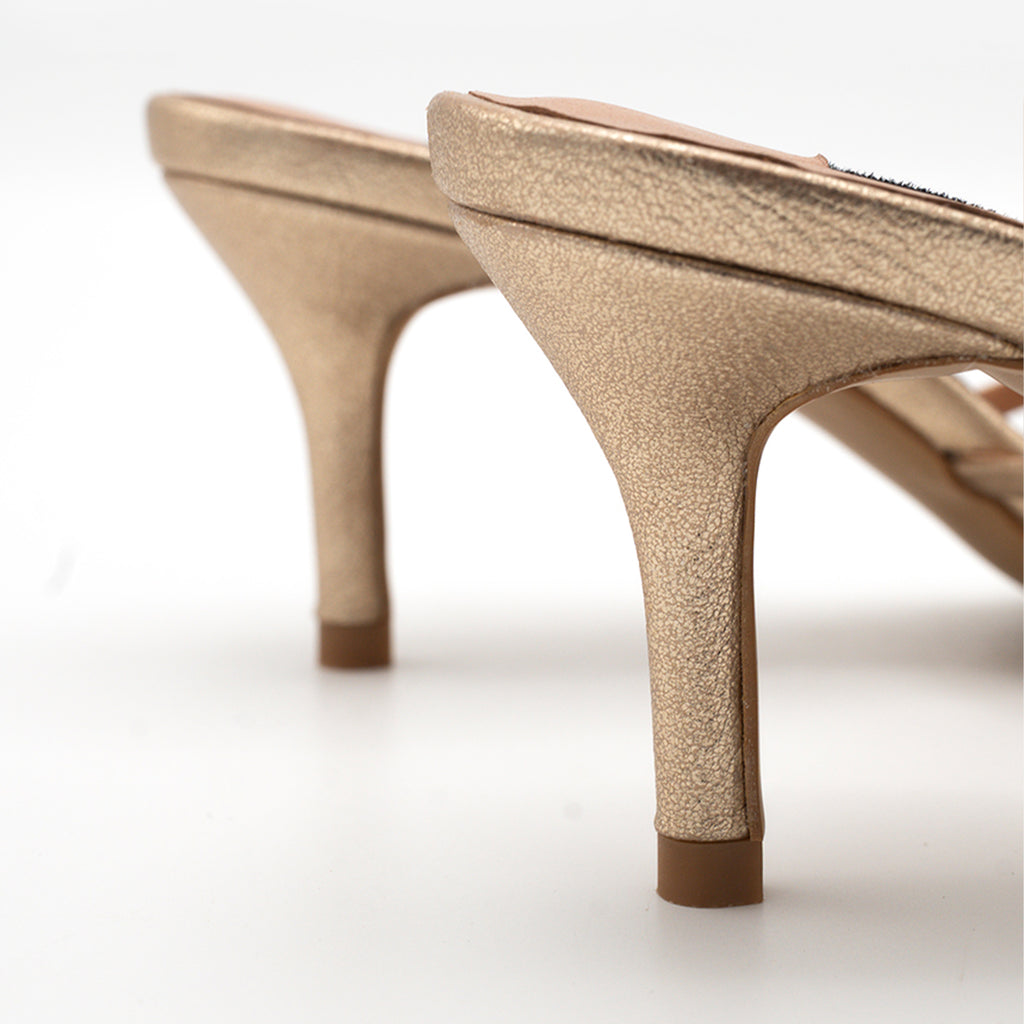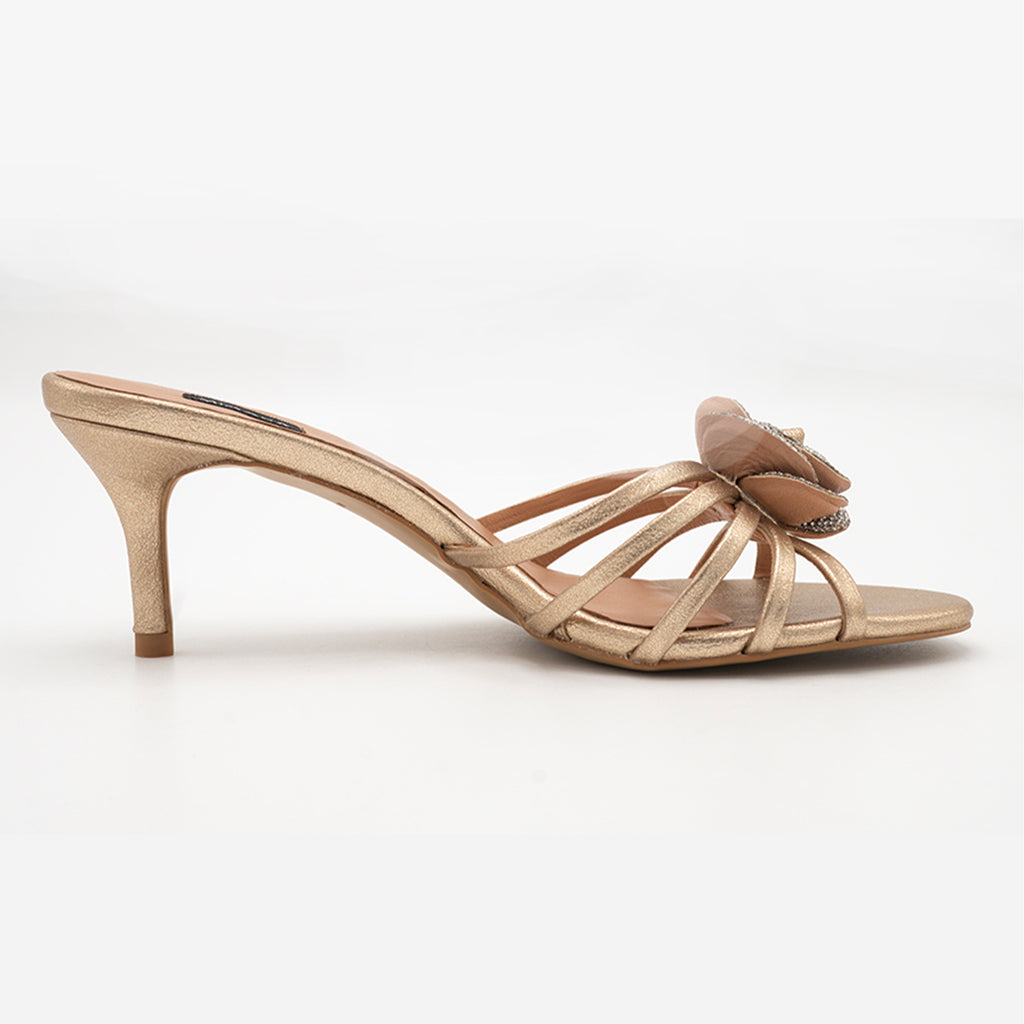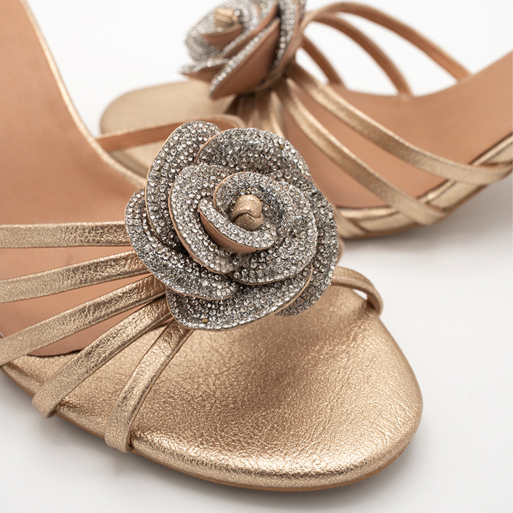 Crafted in a metallic the "Nerisa" heel brings a striking blend of refinement and charm. The delicate strappy design is crowned with a sculpted, crystal-encrusted floral motif that catches the light beautifully.