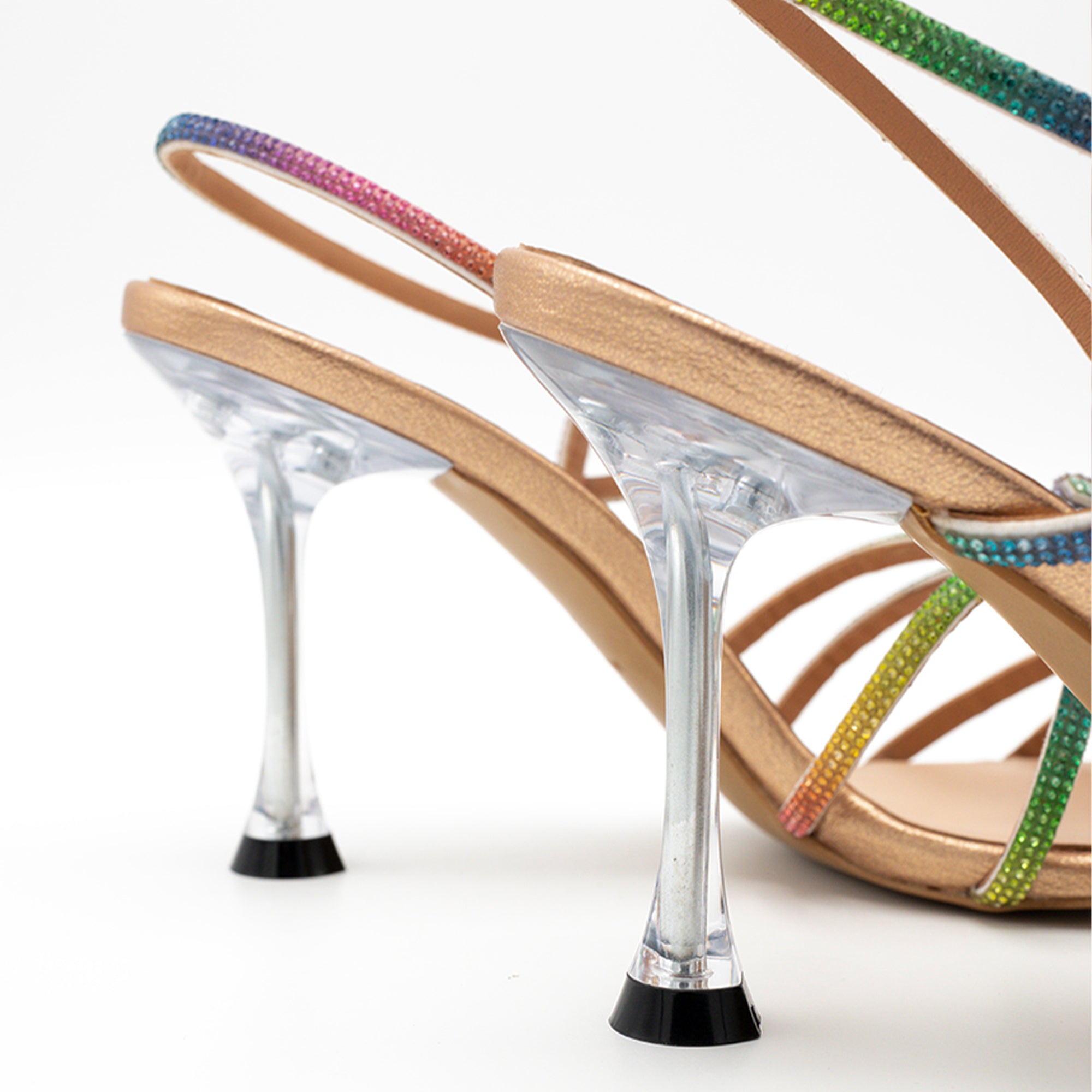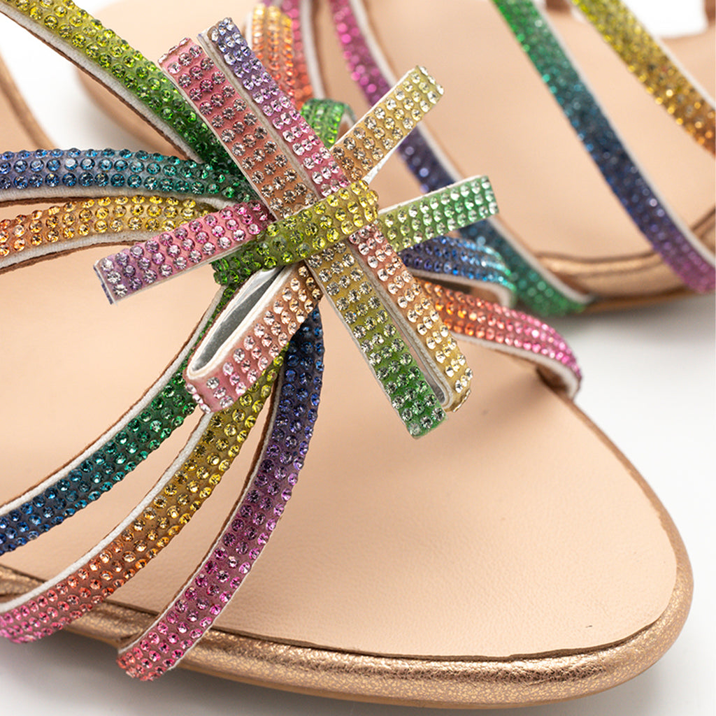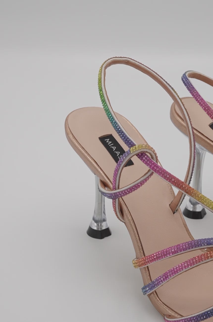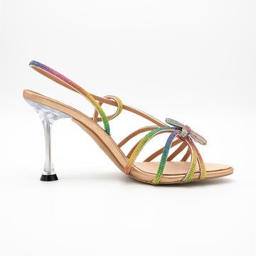 Élise features a pointed silhouette crafted in Multi-colored straps, elevated by crystals. A modern rendition of a cinderella slipper, this statement number promises to turn heads.
