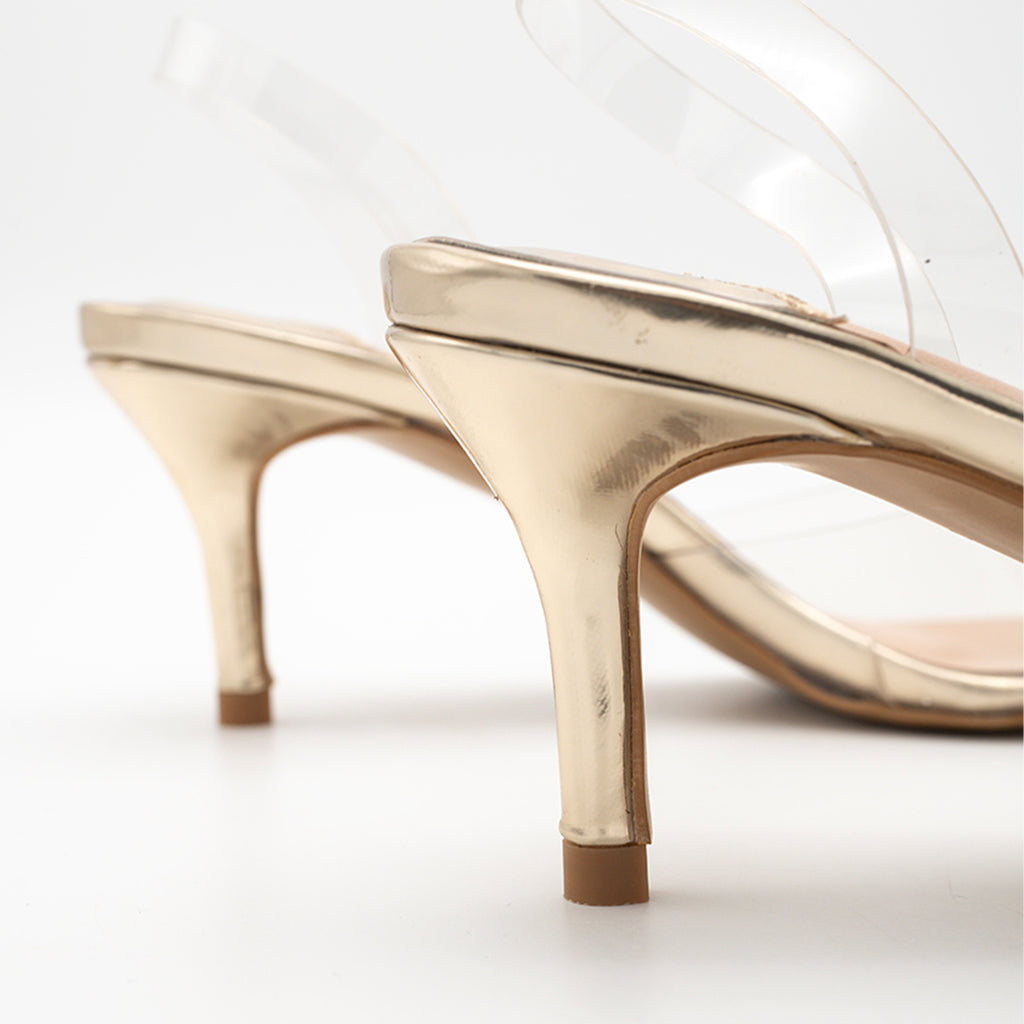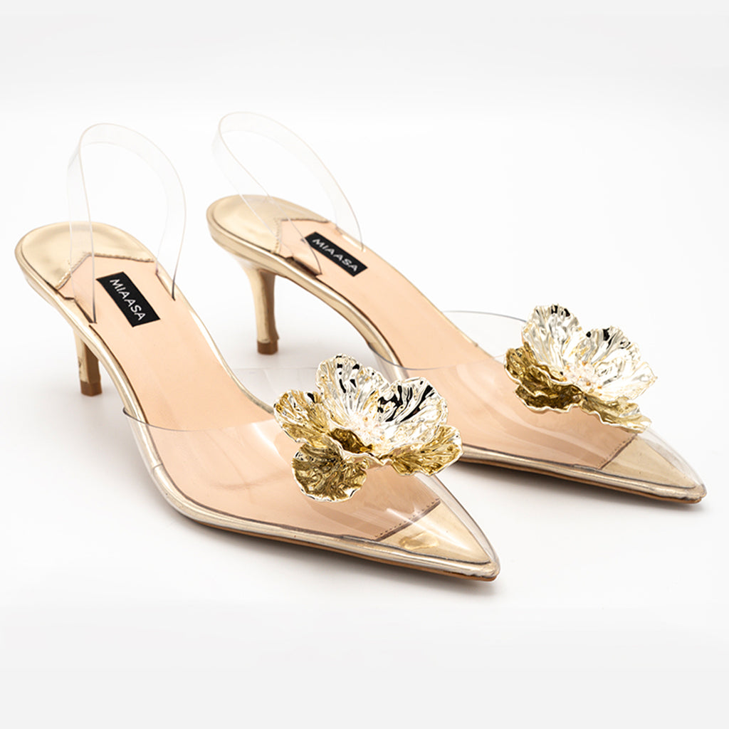 Leyla features a pointed silhouette crafted in clear PVC, elevated by a sculpted metallic oversized flower.  A modern rendition of a cinderella slipper, this statement number promises to turn heads.