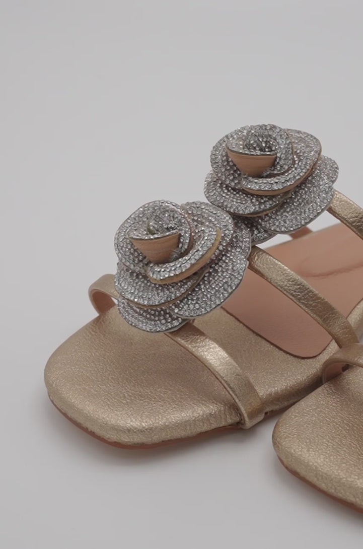Golara' brings bold charm with a double bloom of crystal-studded roses, set against a sleek black base. The glossy straps add a refined touch, while the standout floral detailing offers just the right amount of flair.