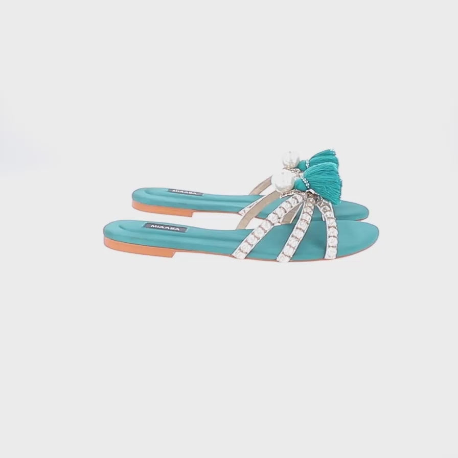 Our signature tasseled beauty, now available in a seasonal new color way. This slide features a three-way crystal embellished strap with a pearl center and handmade tassel.