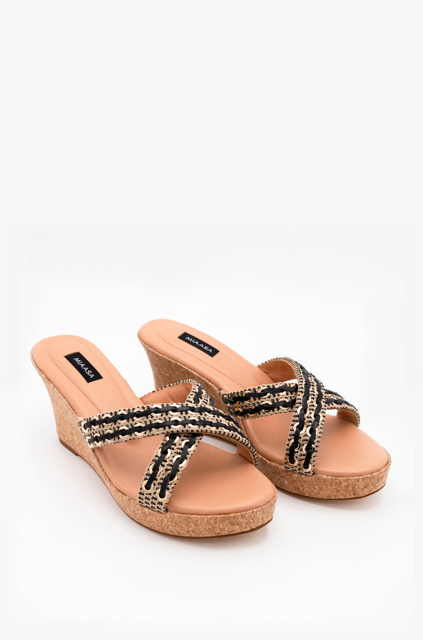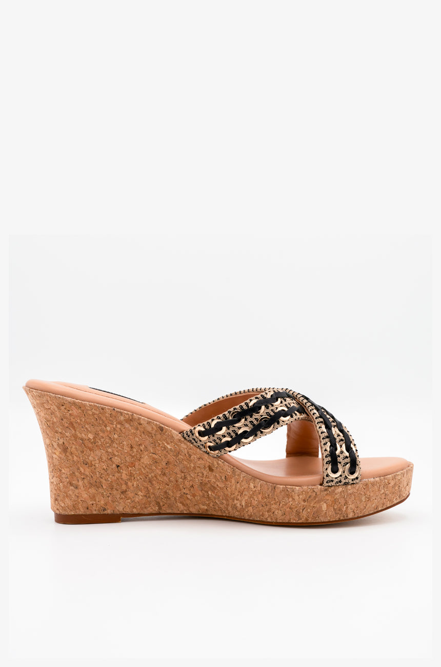 Make a bold style move with 'Nilufer', the perfect blend of comfort and  statement design. Featuring black and taupe woven criss-cross straps with eye-catching gold-toned eyelets, these wedges are made to stand out.