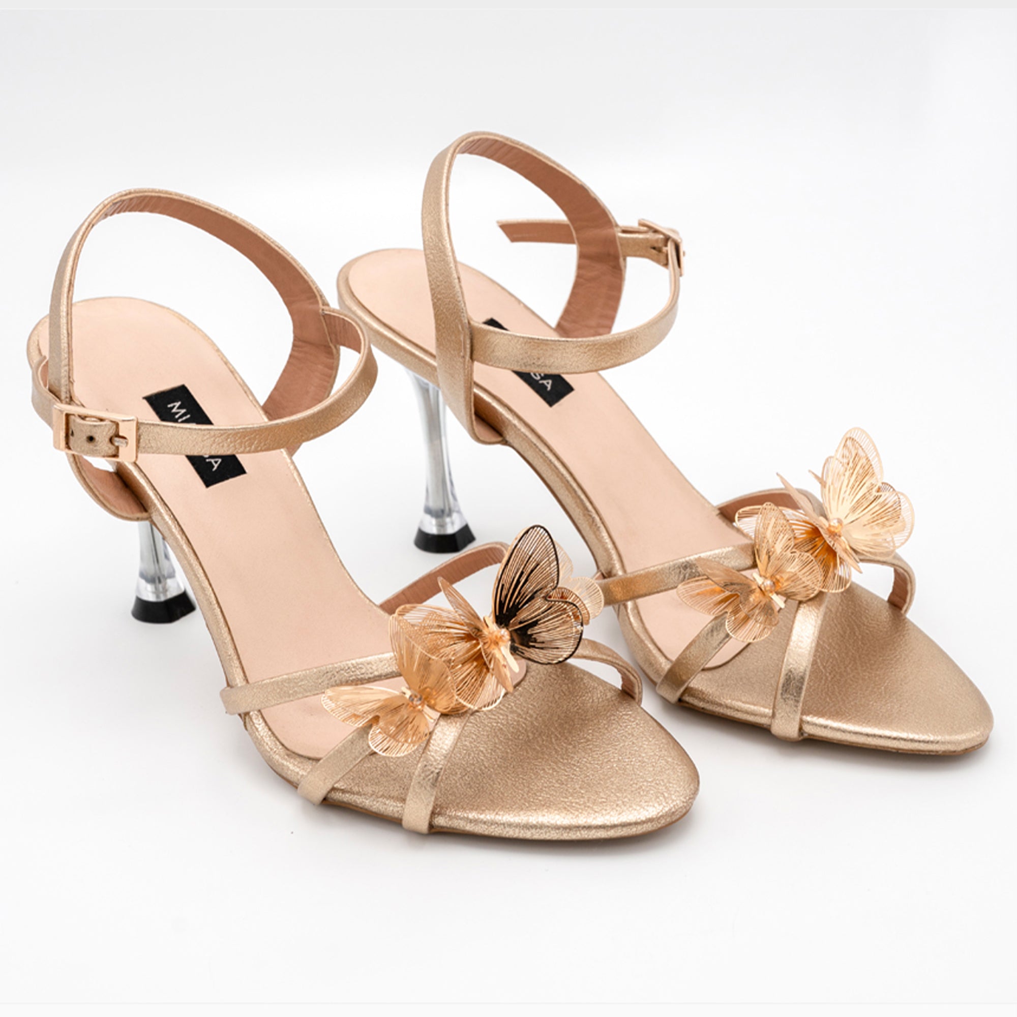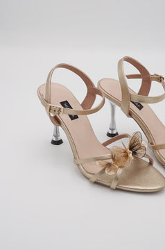 A graceful sandal designed with metallic gold straps, a supportive ankle buckle, and delicate 3D butterfly accents for a standout detail. Set on a sleek 90mm heel, this pair balances charm and style, making it perfect for festive occasions and evening wear.